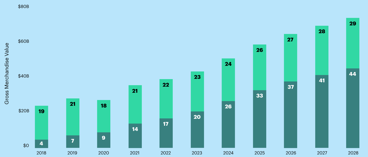 Figure 2. Growth in gross merchandise value from 2018 to projected value in 2028 for resale and non-resale apparel in the U.S.