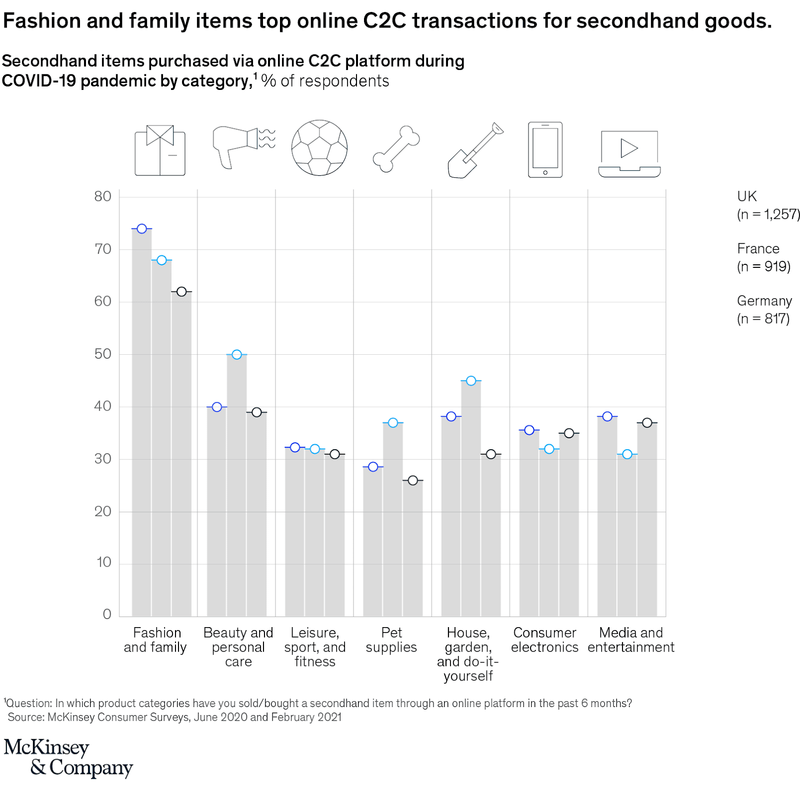 COVID-19 greatly impacted the success of the e-commerce model with restrictions for in-person activity. Lifestyle adjustments resulting from the pandemic pressured businesses to rely on online sales channels. From this change, consumers found that e-commerce is comparably more efficient and less expensive. COVID-19 proved as a driver for the consumer-to-consumer e-commerce model specifically, as many people cleaned out their living spaces and wardrobes during lockdowns, selling these items on online C2C platforms. Among secondhand purchases on C2C platforms, fashion and family items were often purchased more than other categories. On eBay, customers enjoy buying “pre-loved” or secondhand goods because it saves money, considers sustainability, and helps them find unique items.